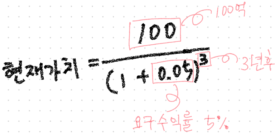 문제2. 현재 투자한 부동산사업을 통해서 3년 후에 100억을 회수할 수 있을 것으로 보인다. 요구수익률은 5%이다. 100억의 현재가치는?