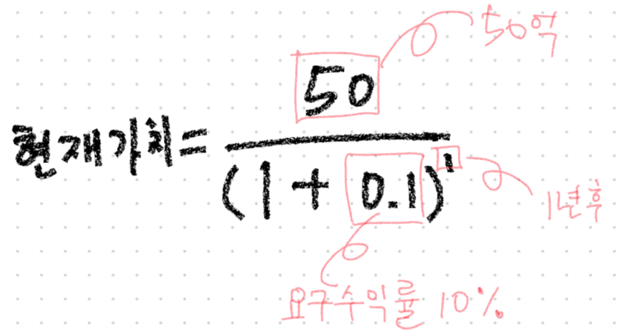 문제1. 현재 투자한 부동산사업을 통해서 1년 후에 50억을 회수할 수 있을 것으로 보인다. 요구수익률은 10%이다. 50억의 현재가치는?