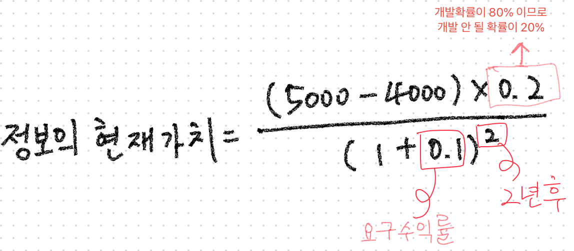 문제3. 어떤 토지가 2년 후 개발되면 5000만원, 개발이 안되면 4000만원으로 예상된다. 개발확률 80%이고 요구수익률이 10%라고 한다.