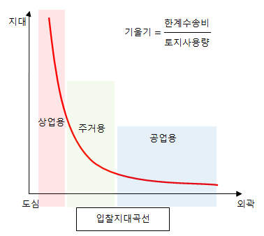 - 도심지역의 이용 가능한 토지는 외곽지역에 비해 한정되어 있어 토지이용자들 사이에 경쟁이 치열해 질 수 있다.