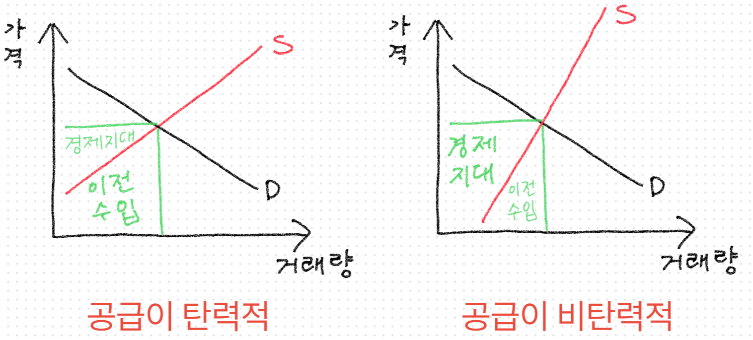 - 공급이 비탄력적일수록 경제지대는 커진다.