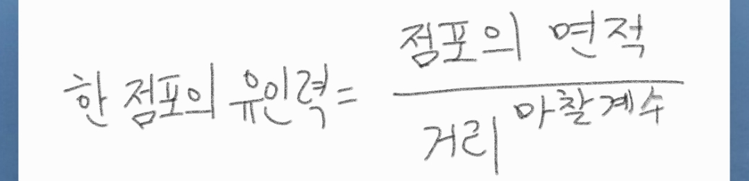 - 유인력(흡인력)은 거리의 마찰계수 거듭제곱에 반비례한다.
